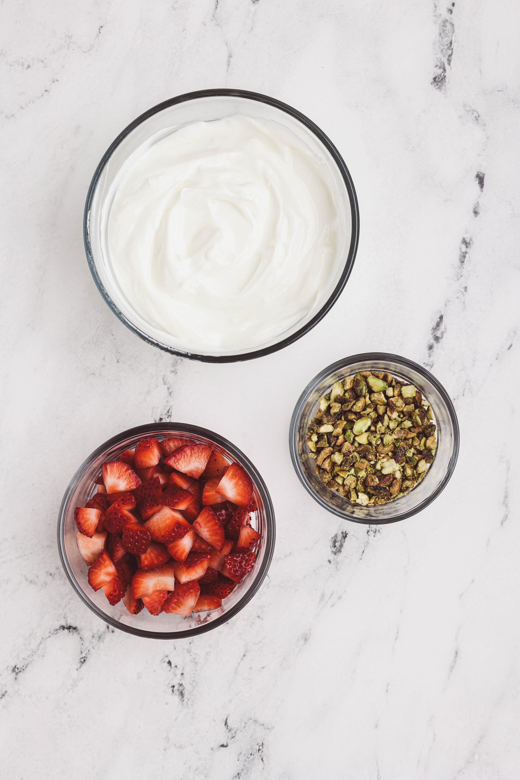 - Only 3 simple ingredients: Fresh strawberries, vanilla yogurt, and pistachios. That’s it.