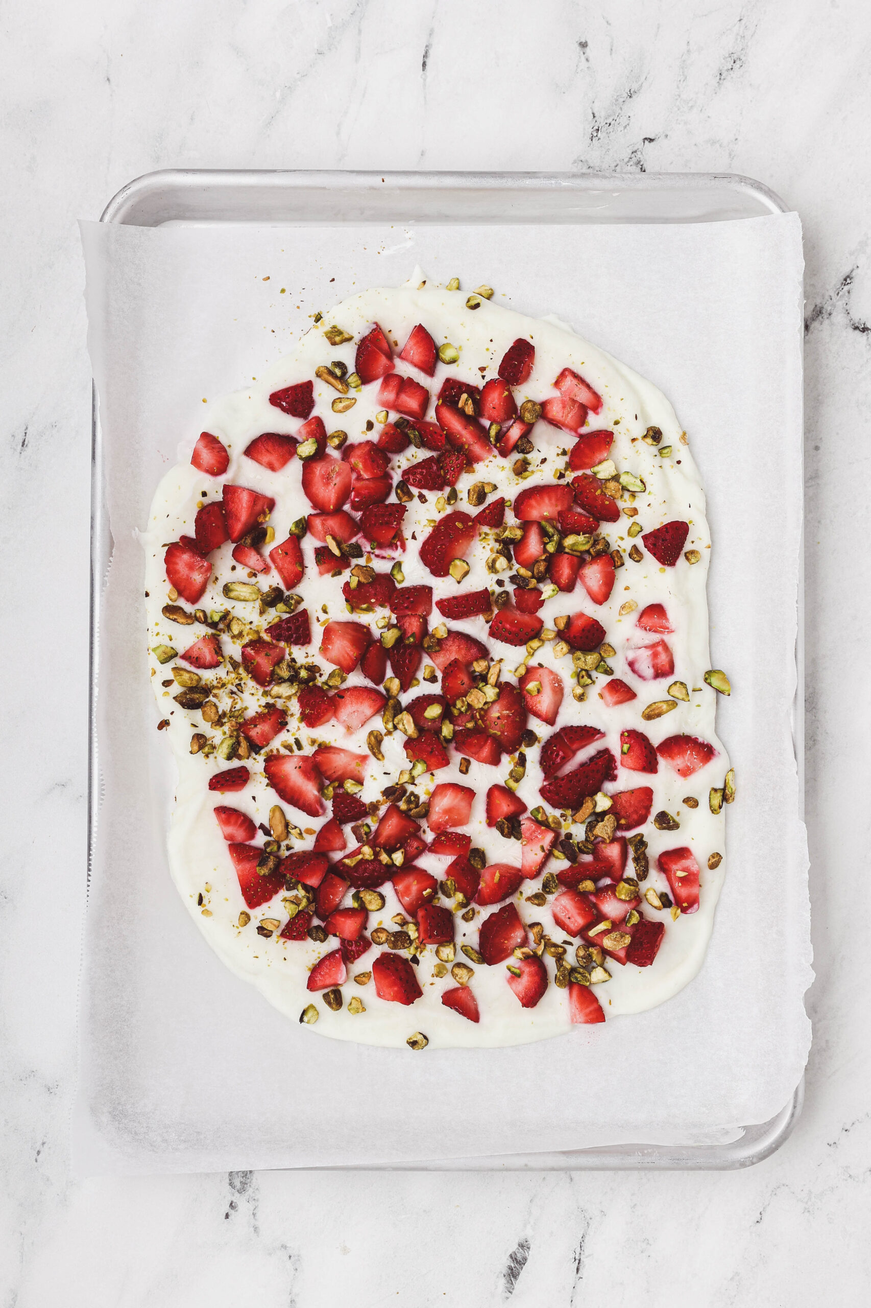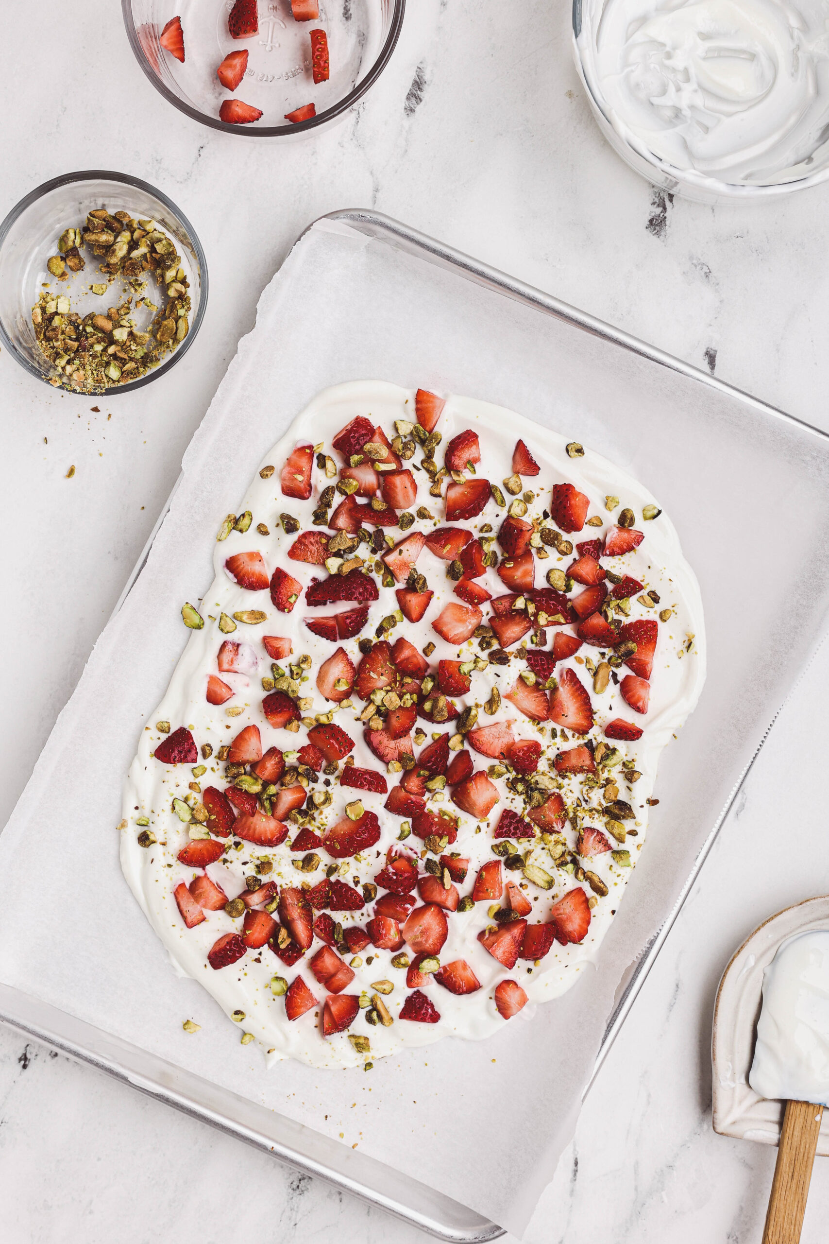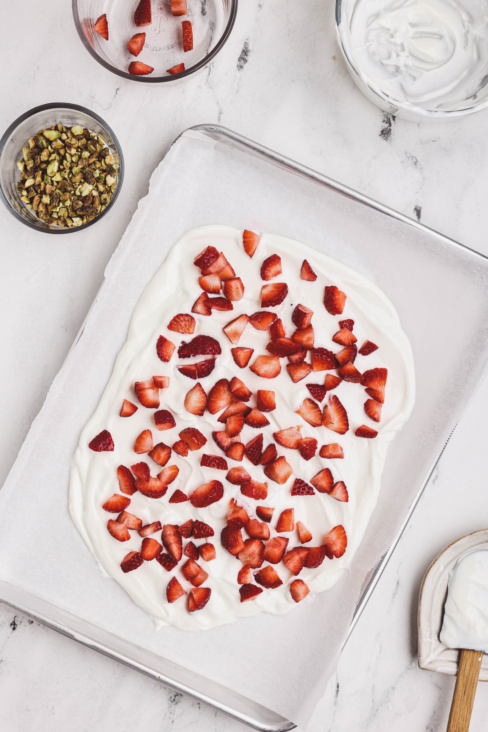 - Step 4: Scatter the sliced strawberries evenly over the yogurt, gently pressing them in so they stick once frozen.