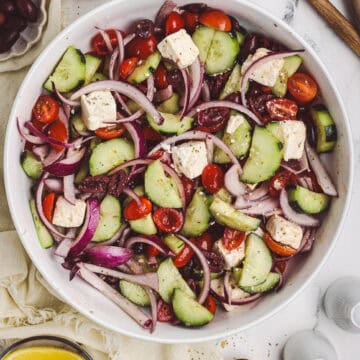 This classic Greek salad is fresh, simple, and full of flavor. Made with ripe tomatoes, crisp cucumbers, briny olives, and a slab of feta, it’s lightly dressed with an olive oil, red wine vinegar, lemon, and oregano dressing for an authentic Mediterranean dish that’s perfect as a side or light meal.